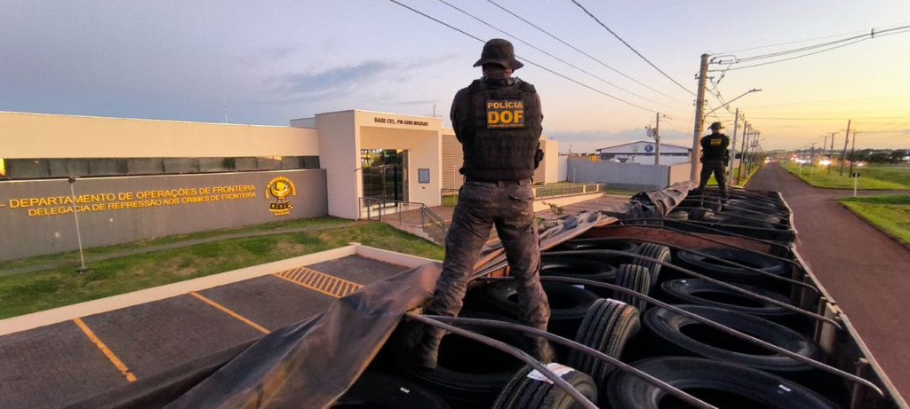 Policiais do DOF (Departamento de Operações de Fronteira) apreenderam na tarde desta segunda-feira (19/1), em Maracaju, 207 pneus para caminhão que eram transportados em uma carreta bitrem Scania. Na ação, dois homens, de 47 e 51 anos, foram presos.